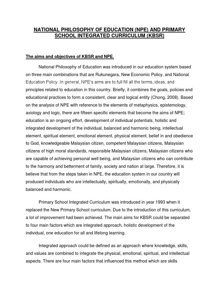 The national philosophy of education (npe) was formulated in 1988 as the philosophical guide to all educational activities in malaysia. The essence of national philosophy of education (npe) is as follows education in malaysia is an ongoing effort towards further developing the potential of individuals in a holistic and integrated manner, in order to produce individuals who are intellectually, spiritually, emotionally and physically, balanced and harmoniously, based on a firm. It sets the values and principles of the malaysian education system from the primary to the tertiary level. Highlights of the national education blueprint. Introducing the learning concept by applying skills kbsm the existed schooling system is continued.